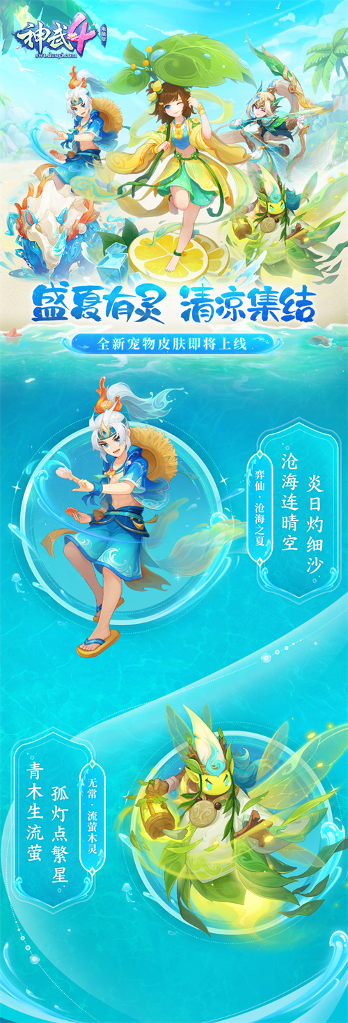 “无常·流萤木灵”和“弈仙·沧海之夏”夏季全新皮肤本周五上线。6月25日至27日,55级以上的服务器将开启新宠物皮肤的节日拍卖活动,各位少侠不要错过。