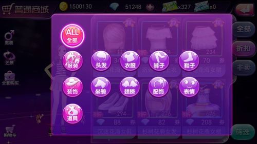 当然没有看到喜欢的东西,还可点击全部,进入分类区。这里对商城物品进行了详细具体的划分,有服装,头发,衣服,裤子,鞋子,装饰,坐骑,翅膀,配饰,表情,道具等。在这里大家可以根据需要看你所看,买你所爱。